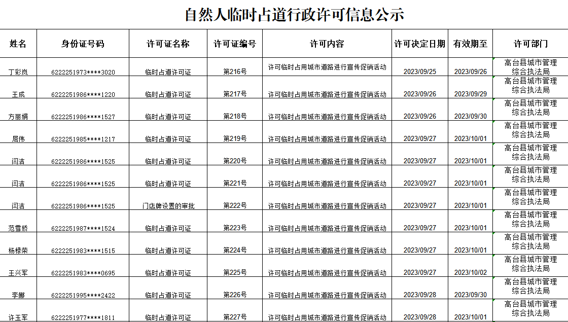 现将高台县城区临时占道摊位自然人行政许可信息(10月)公开如下: