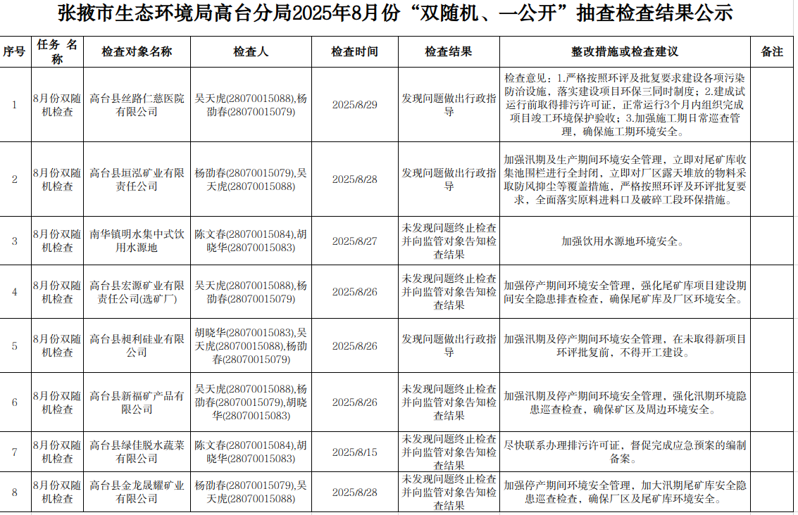 现将张掖市生态环境局高台分局2025年8月份“双随机、一公开”现场检查情况公示如下: