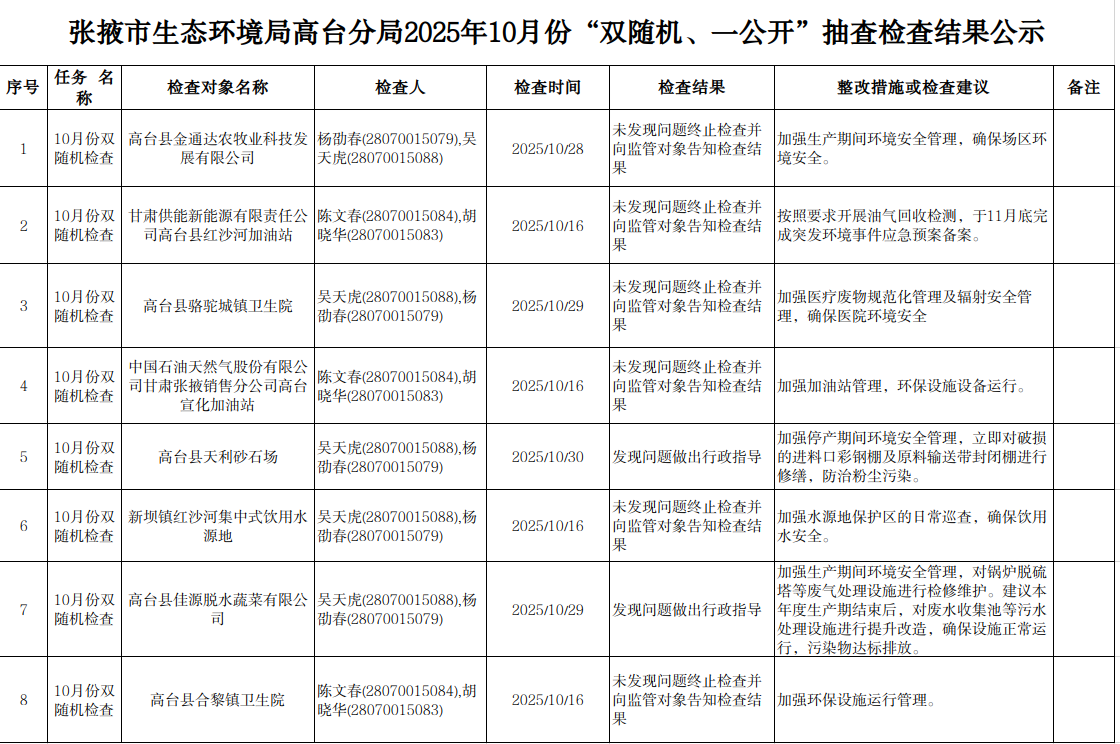 现将张掖市生态环境局高台分局2025年10月份“双随机、一公开”现场检查情况公示如下: