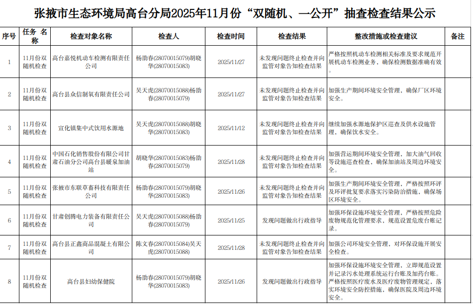 现将张掖市生态环境局高台分局2025年11月份“双随机、一公开”现场检查情况公示如下: