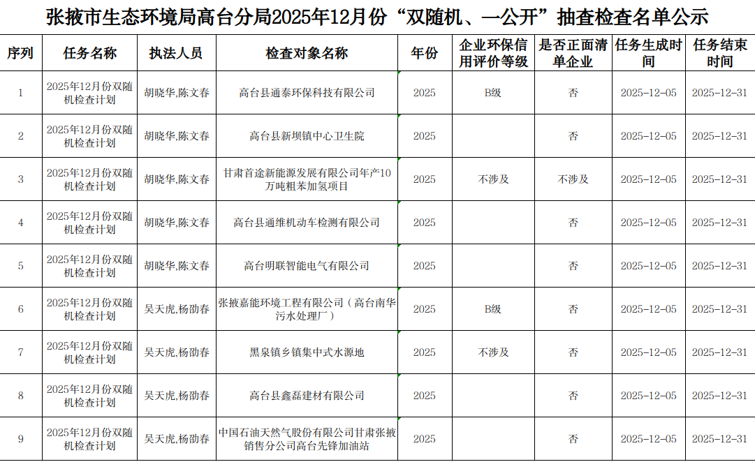 按照“双随机、一公开”工作公示要求,现将2025年12月份“双随机、一公开”现场检查抽查对象予以公示,接受公众监督。
