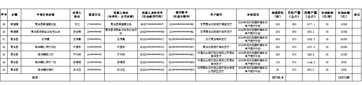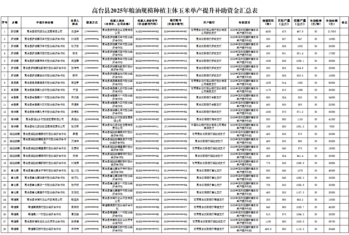 高台县2025年粮油规模种植主体玉米单产提升结果公示