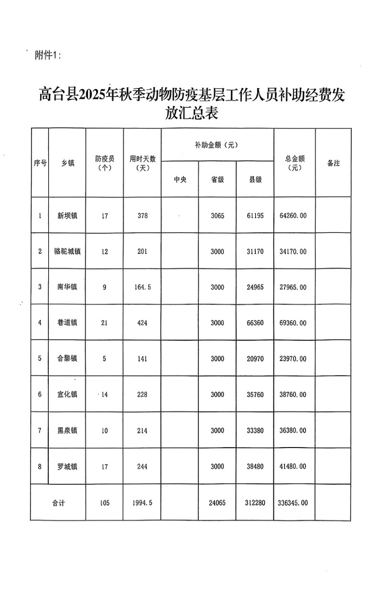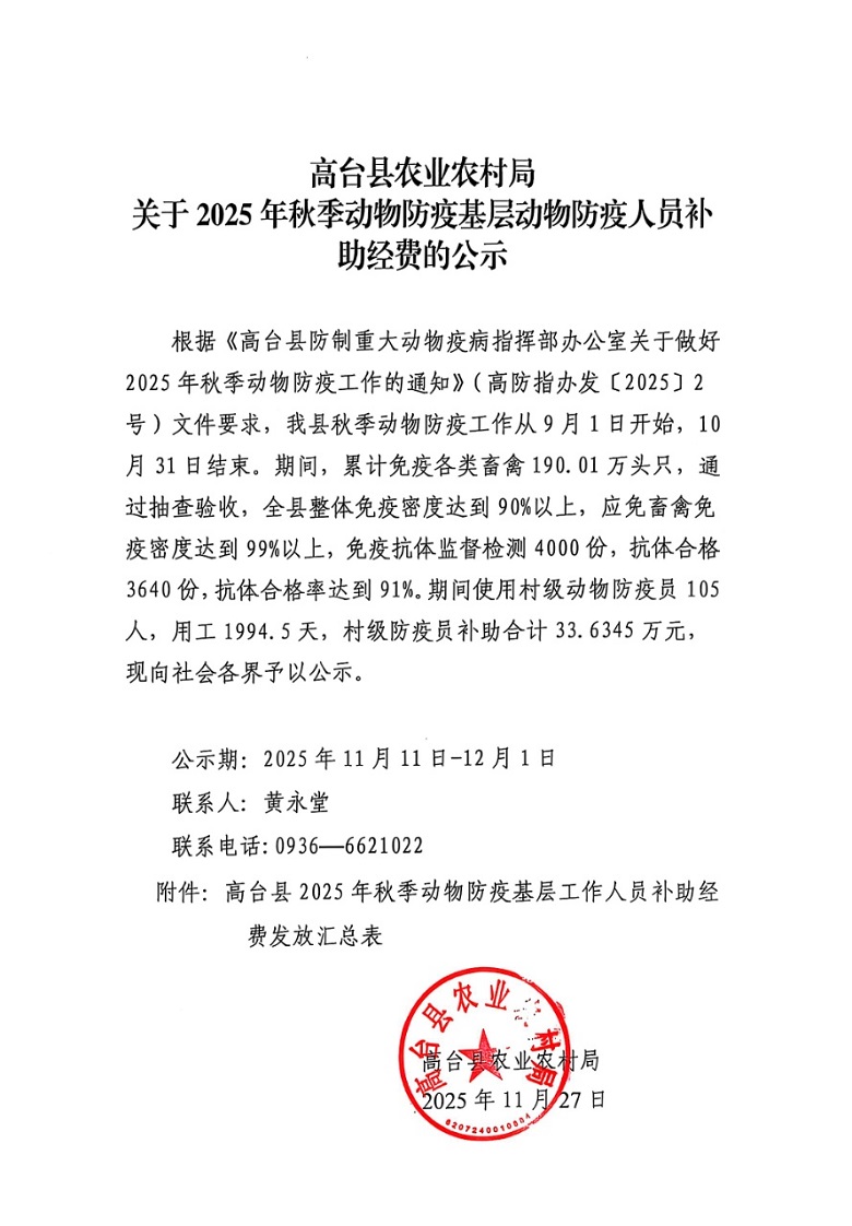 高台县农业农村局关于2025年秋季动物防疫基层动物防疫人员补助经费的公示