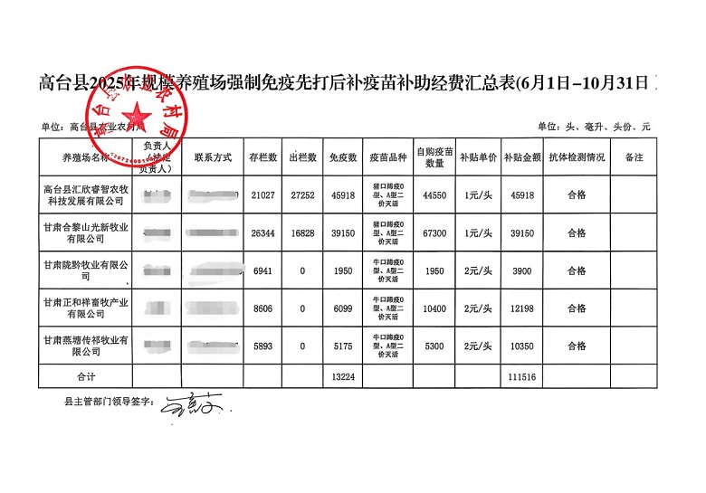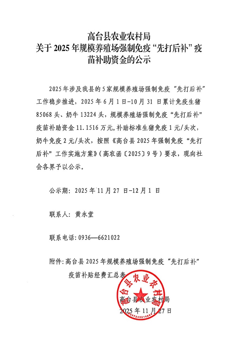 高台县农业农村局 关于2025年规模养殖场强制免疫“先打后补”疫苗补助资金的公示