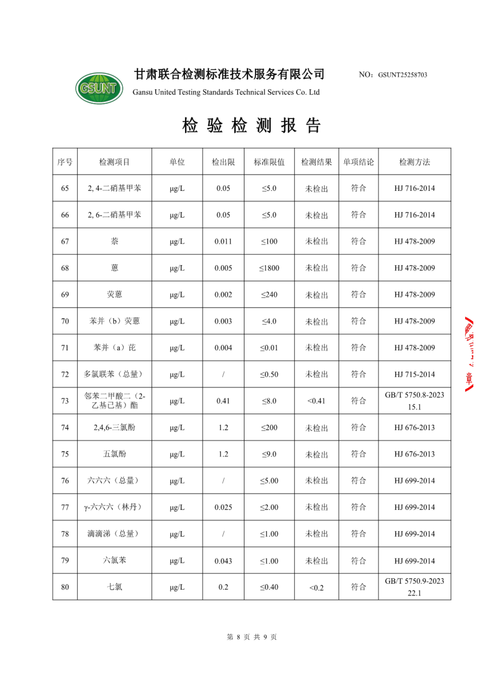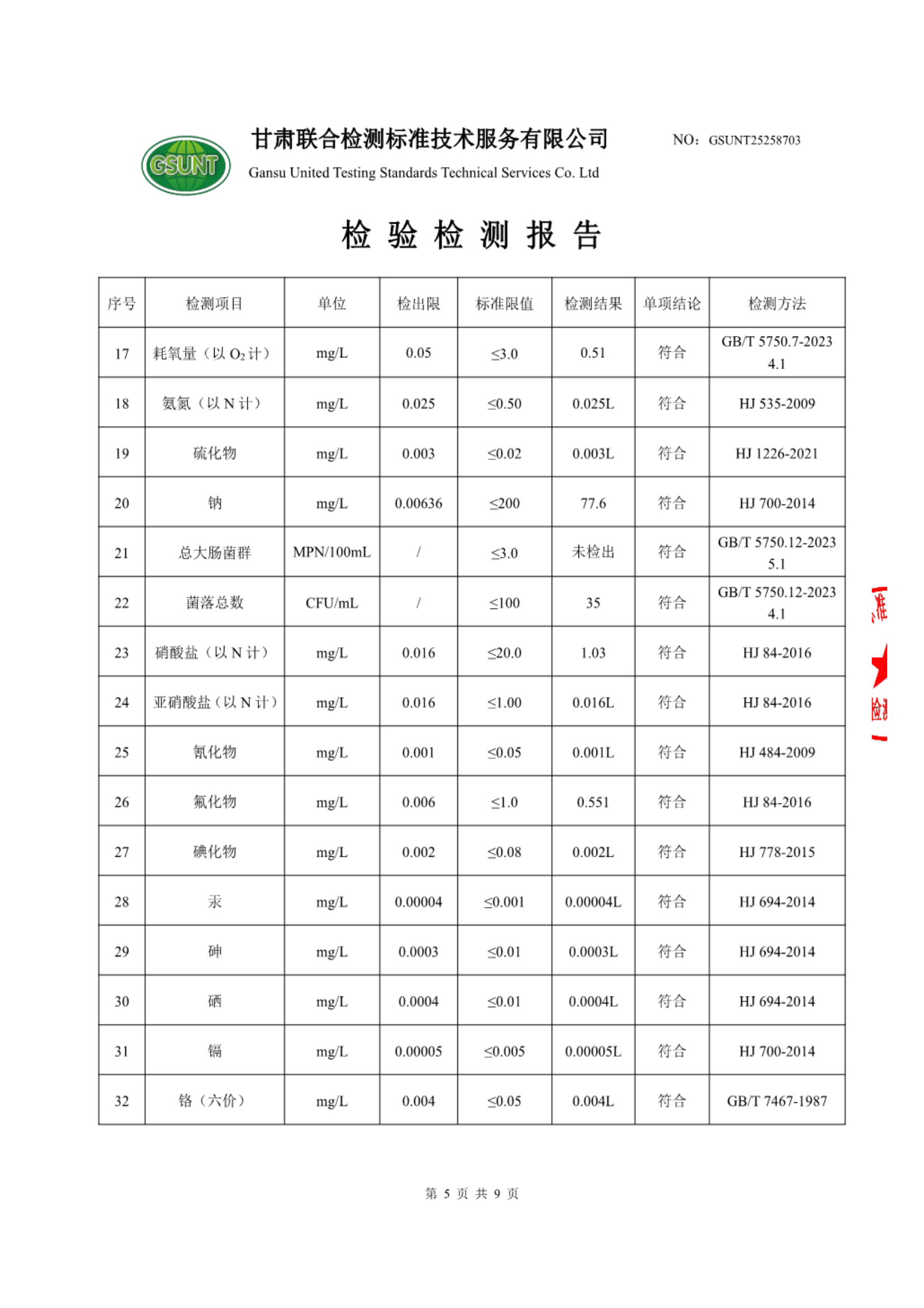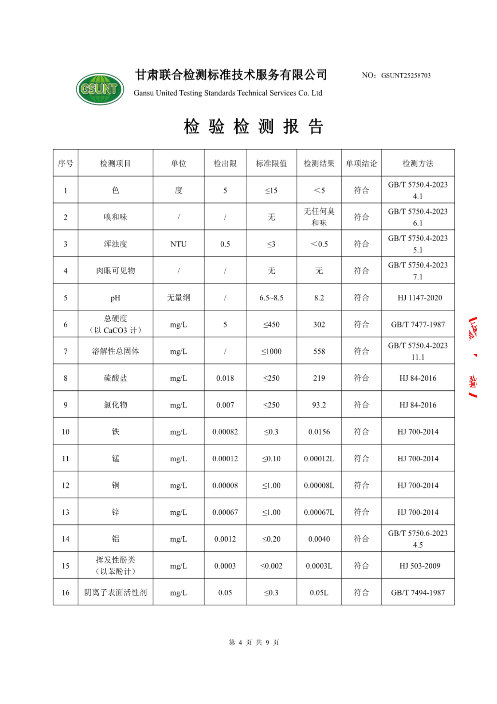 高台县城区饮用水2025年7月份水质(水源水)检测报告