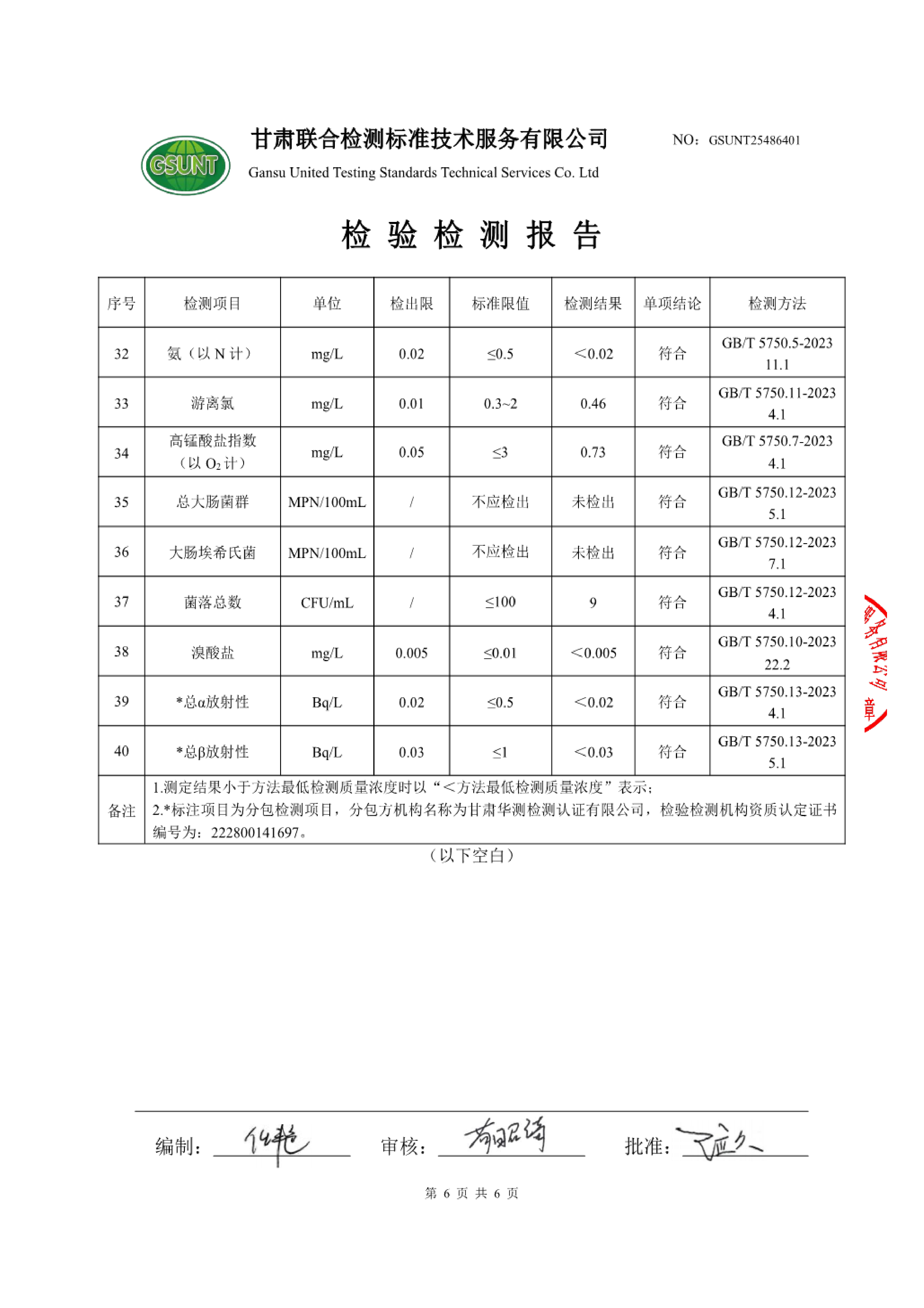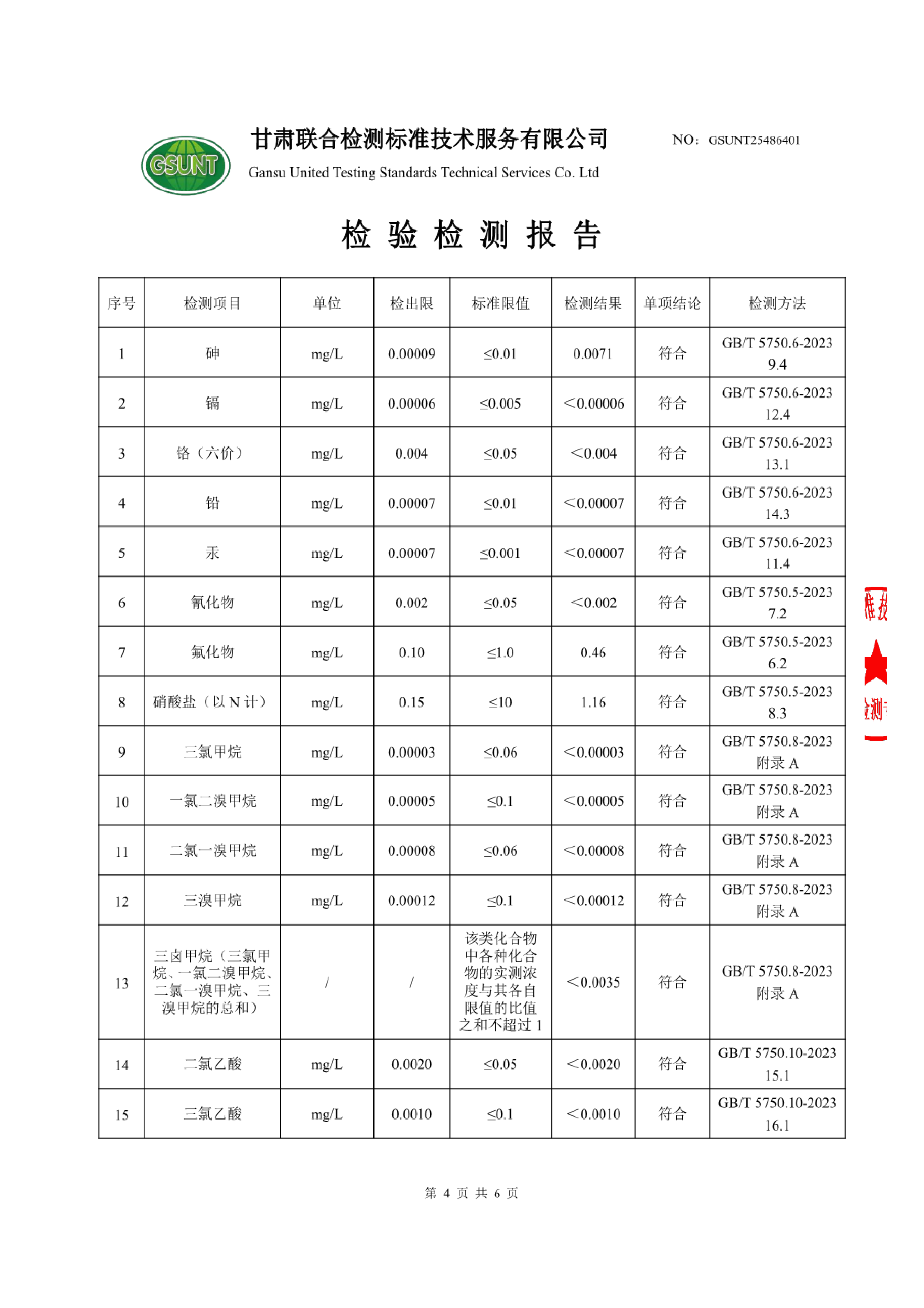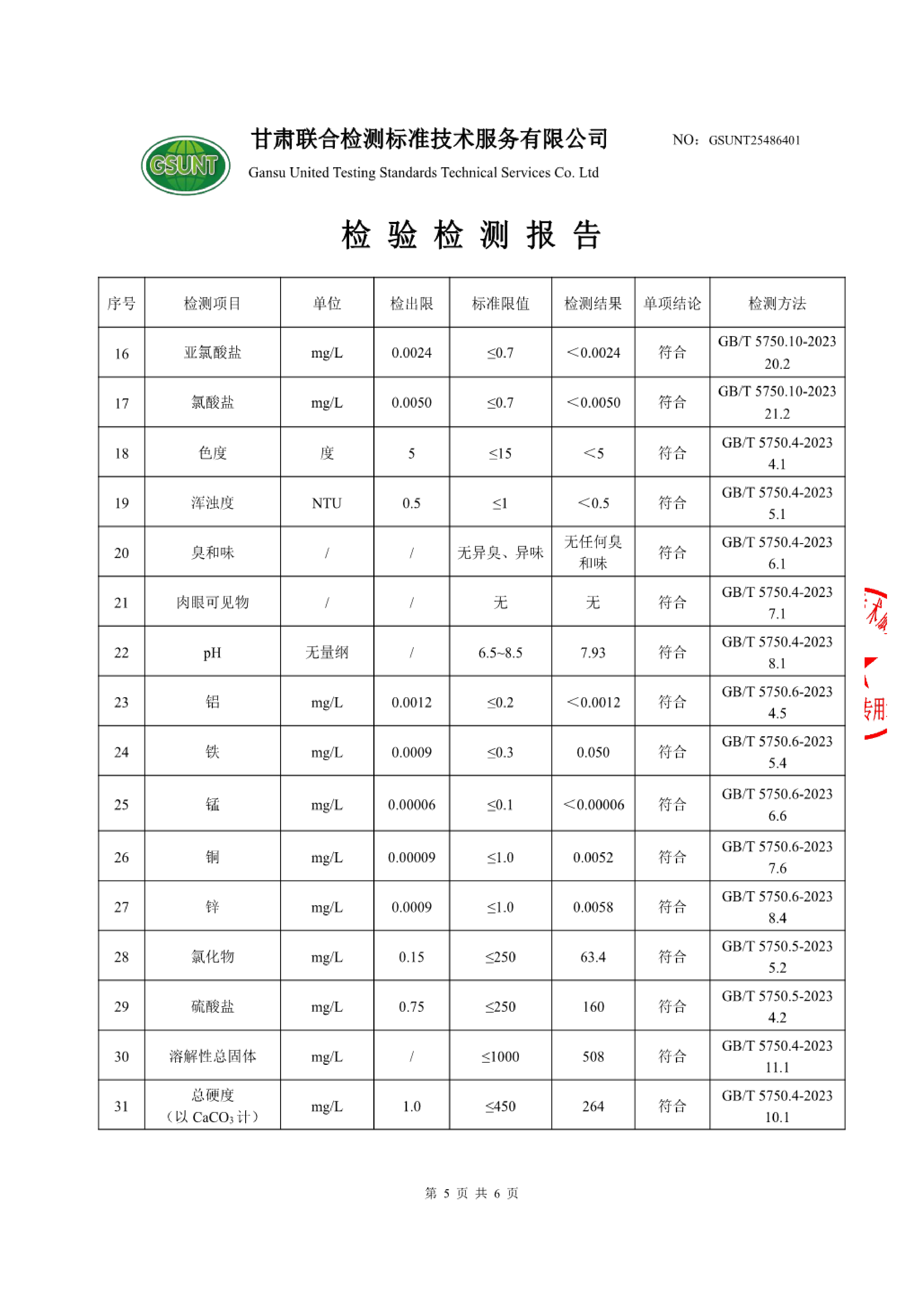 高台县城区饮用水2025年11月份水质(出厂水)检测报告