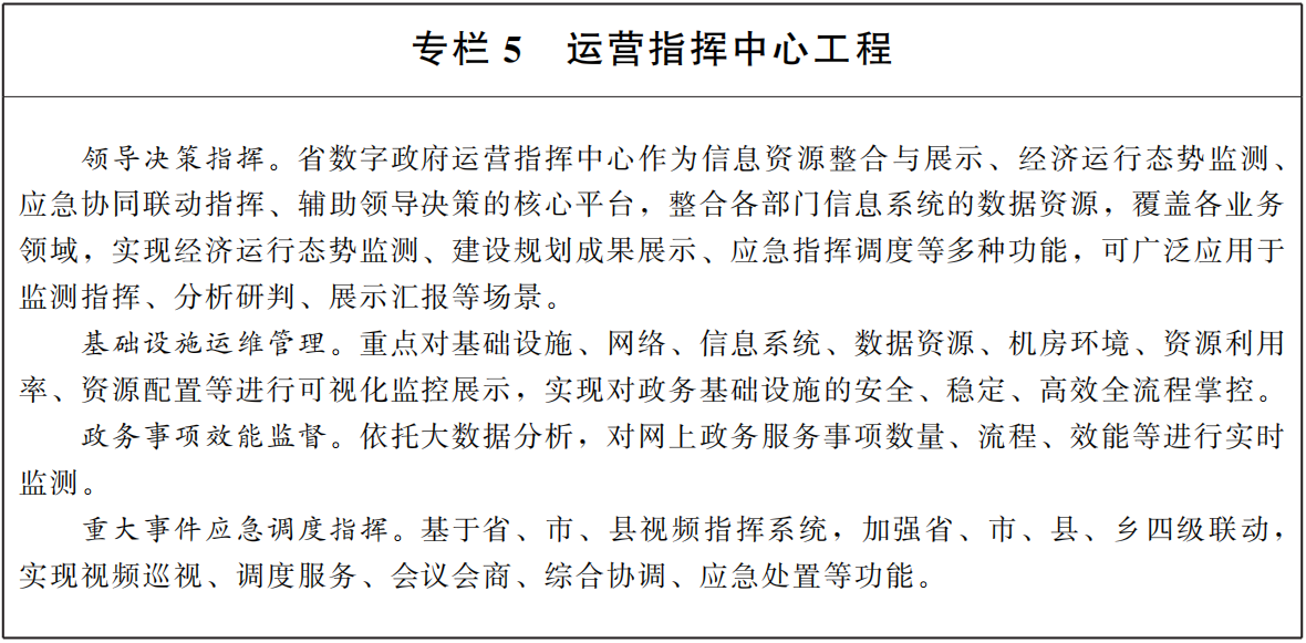 5.建设省级运营指挥中心。甘肃省数字政府运营指挥中心作为数字政府支撑、统筹、管理的核心枢纽,发挥政务服务监测、服务效能评价、特别事项呈报、应急指挥调度等功能,按照战时指挥、平时服务的要求,提升政府管理和服务能力,实现各部门数据的互联互通,促进信息资源共享。