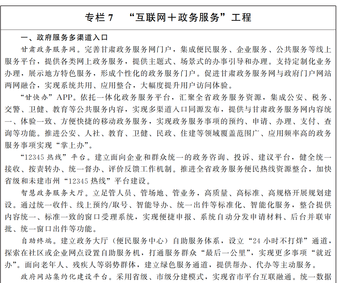 到2025年,数字技术广泛应用于政府决策和管理服务,政府履职的数字化智能化水平显著提升,升级重构全省一体化政务服务平台和一体化在线监管平台,打造“甘快办”“甘政通”“12345热线”“不来即享”四个甘肃省数字政府特色品牌,形成完善的数字政府标准规范、应用支撑、数据资源、基础支撑、组织机制、制度规则、人才培养、安全保障、考核评价等体系,建成中西部领先、全国一流的服务型数字政府,有力引领智慧城市、数字经济、数字社会发展。