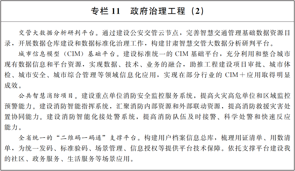 增强公共安全智能化。建立信息化、智能化的公安机关服务体系,推动人工智能在社会发展、服务群众、服务企业等公安政务服务领域的深度应用。统筹公安大数据智能化框架体系建设,持续增强数据融合治理能力、强化云平台支撑能力、提升大数据平台服务水平、完善安全防御体系建设,实现甘肃公安大数据平台与全国公安大数据平台互联互通。增强安全生产、食品药品、生物安全等领域安全保障协同能力。加强应急消防救援处置体系建设,全面提升面向灾害的研判预警、安全监控、智能指挥、处置协同等能力。